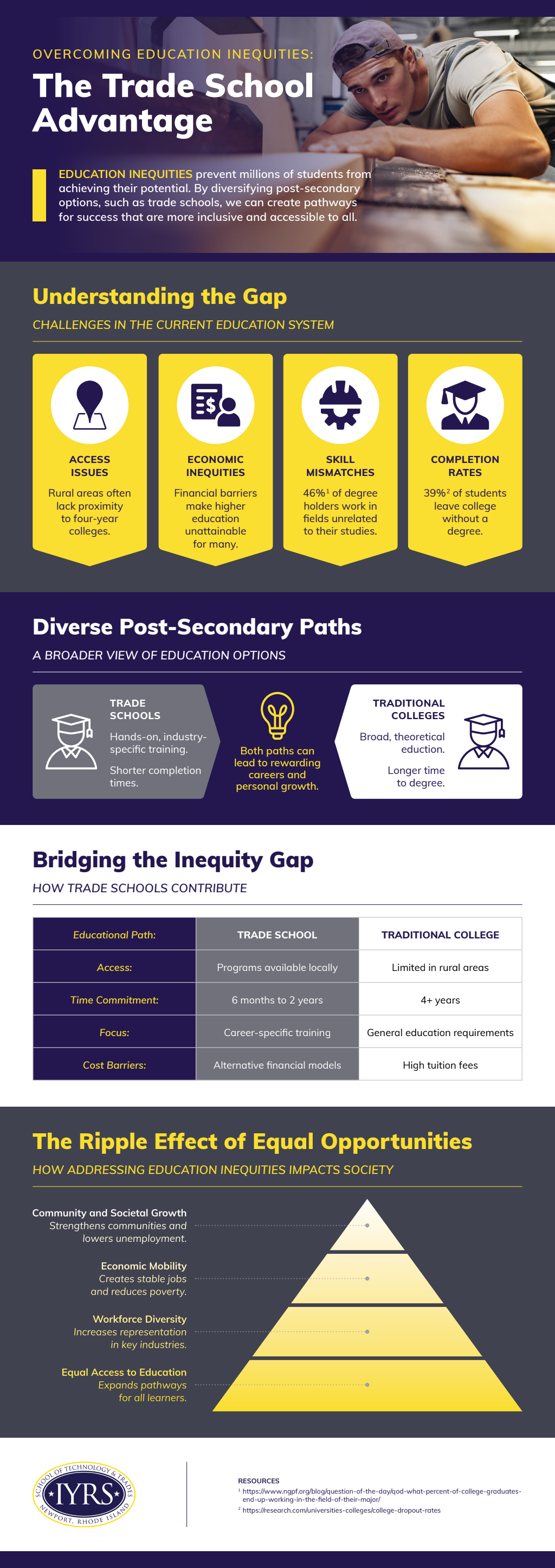 Trade schools offer a practical and accessible route to overcoming education inequities. Career-focused learning, affordable programs, exposure to modern technologies, and community engagement provide students with tangible skills and professional confidence. Expanding access to these programs is a critical step in ensuring that all students, regardless of background, can achieve economic mobility and meaningful employment. To learn more, check out the infographic below.